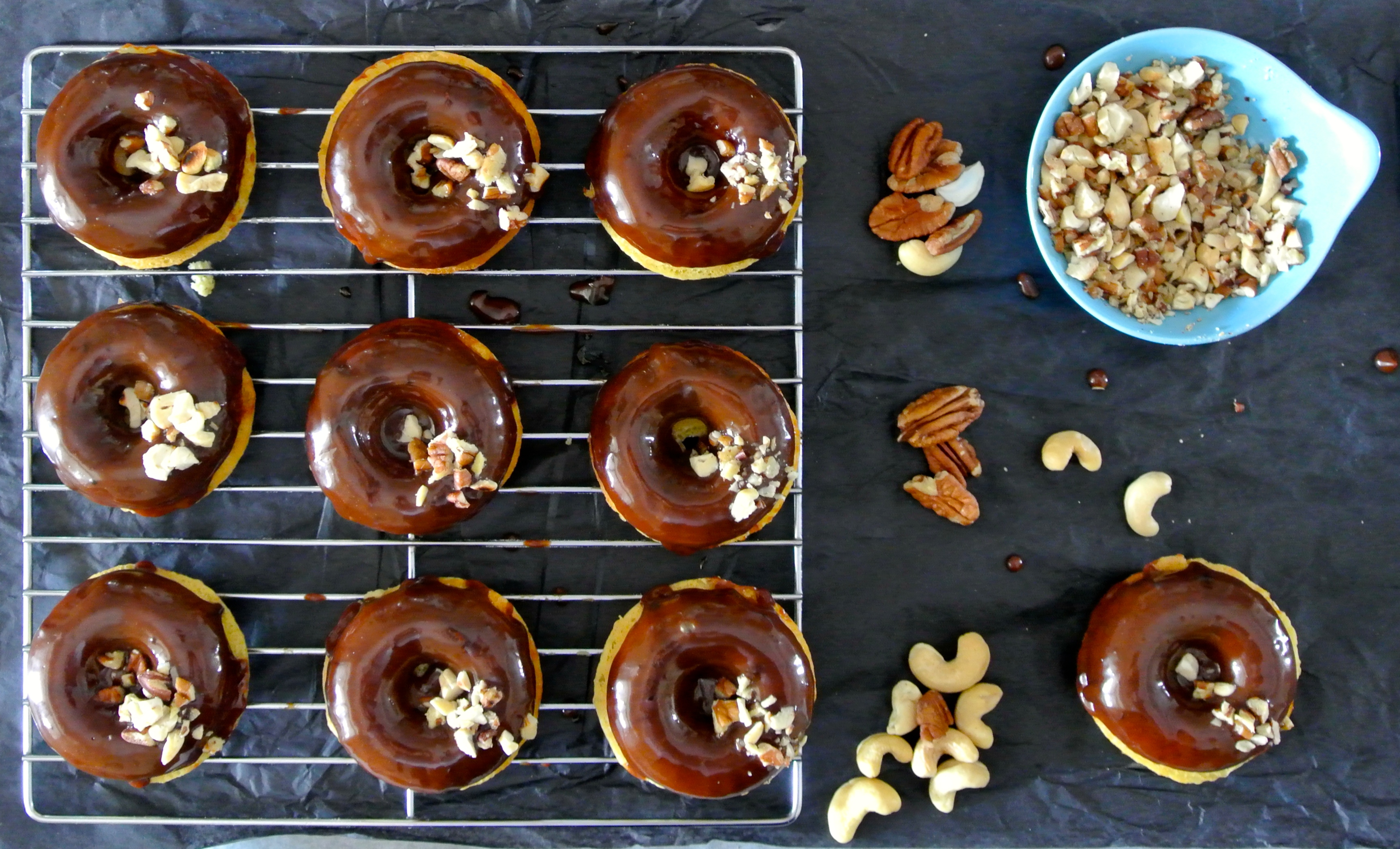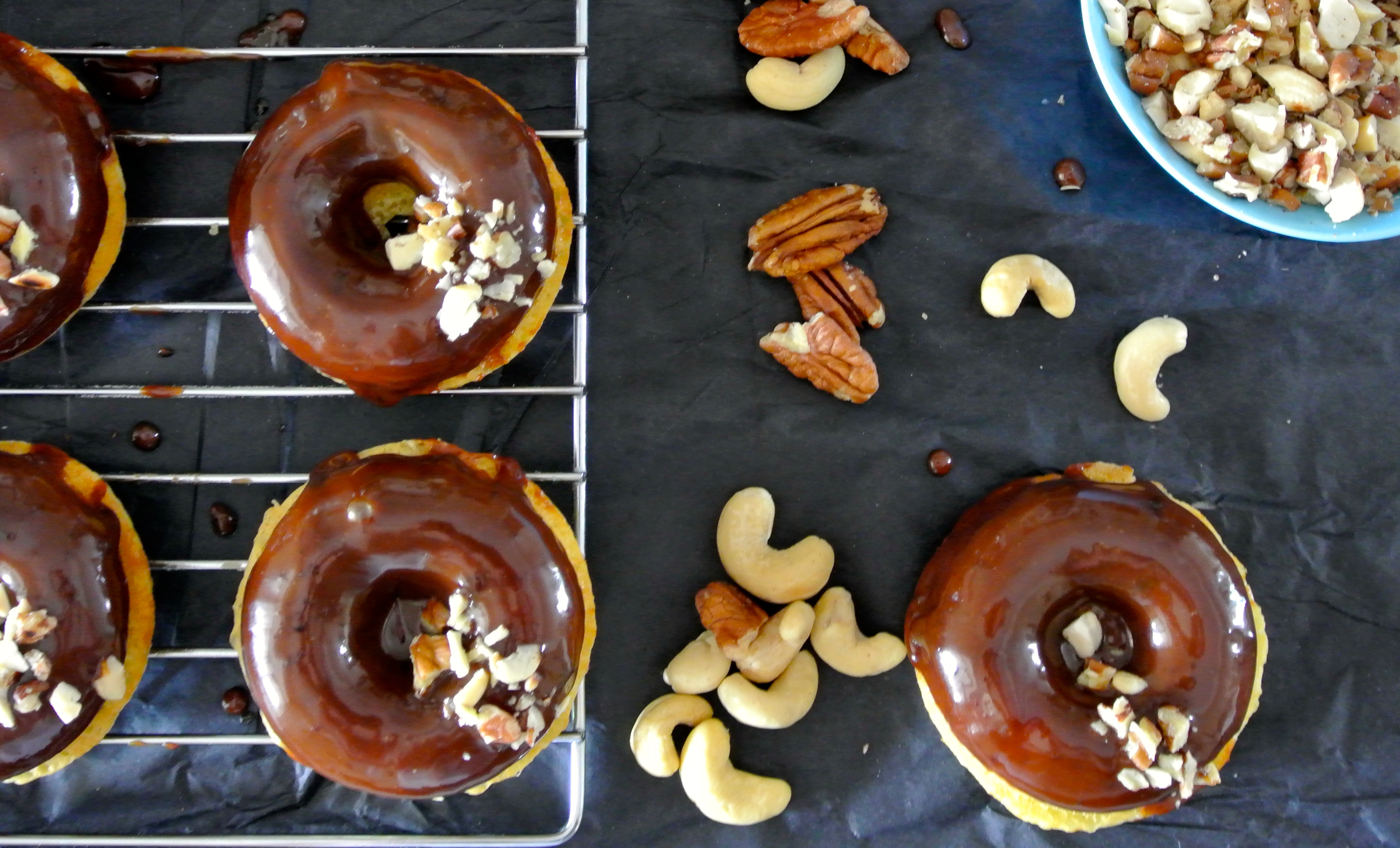 The recipe, adapted slightly from Sugar et Al, yields pillowy, vanilla bean-dotted doughnuts that, even when glazed and topped with chopped pecans and cashews, will melt in your mouth. The piece de resistance however is that caramelised white chocolate ganache; you’ll be hard pressed to stop licking your fingers. So, so good.