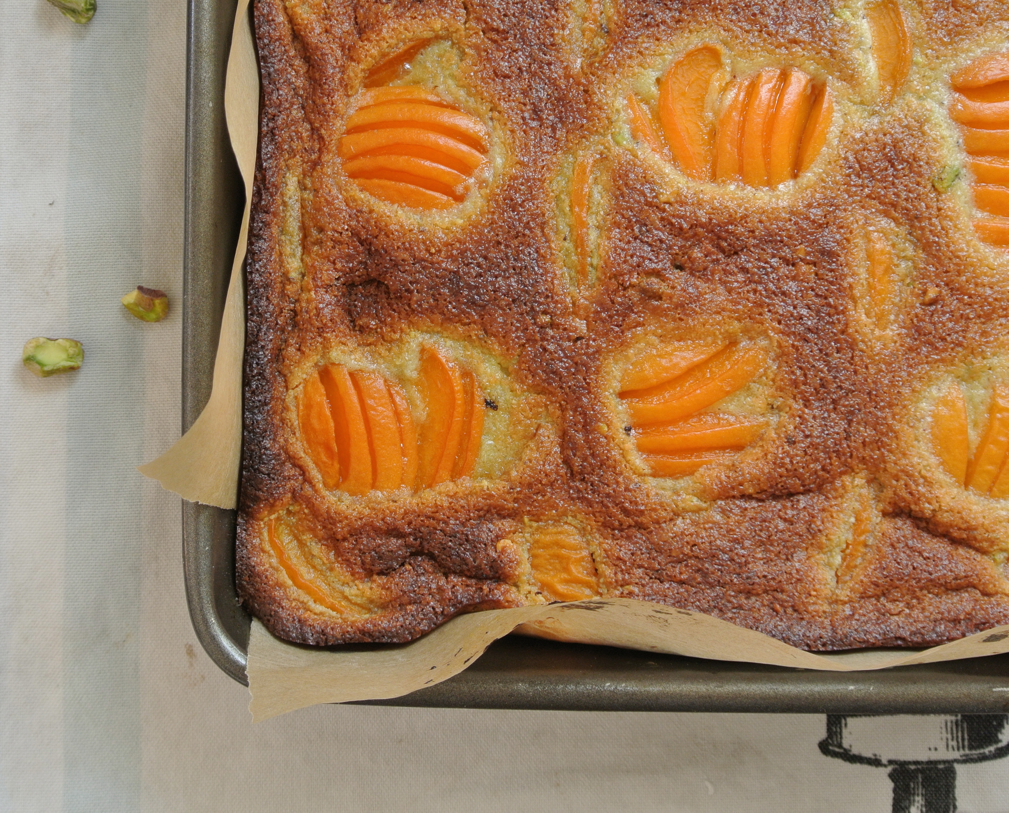 The originals I tasted in Paris were little, beautiful, buttery tartlets topped with almond paste and chopped apricots. Out of greed, but also out of convenience, I adapted the recipe to resemble a tray bake, with a crispy crust on the bottom, an almond pistachio paste spread and sliced apricots to finish it off.