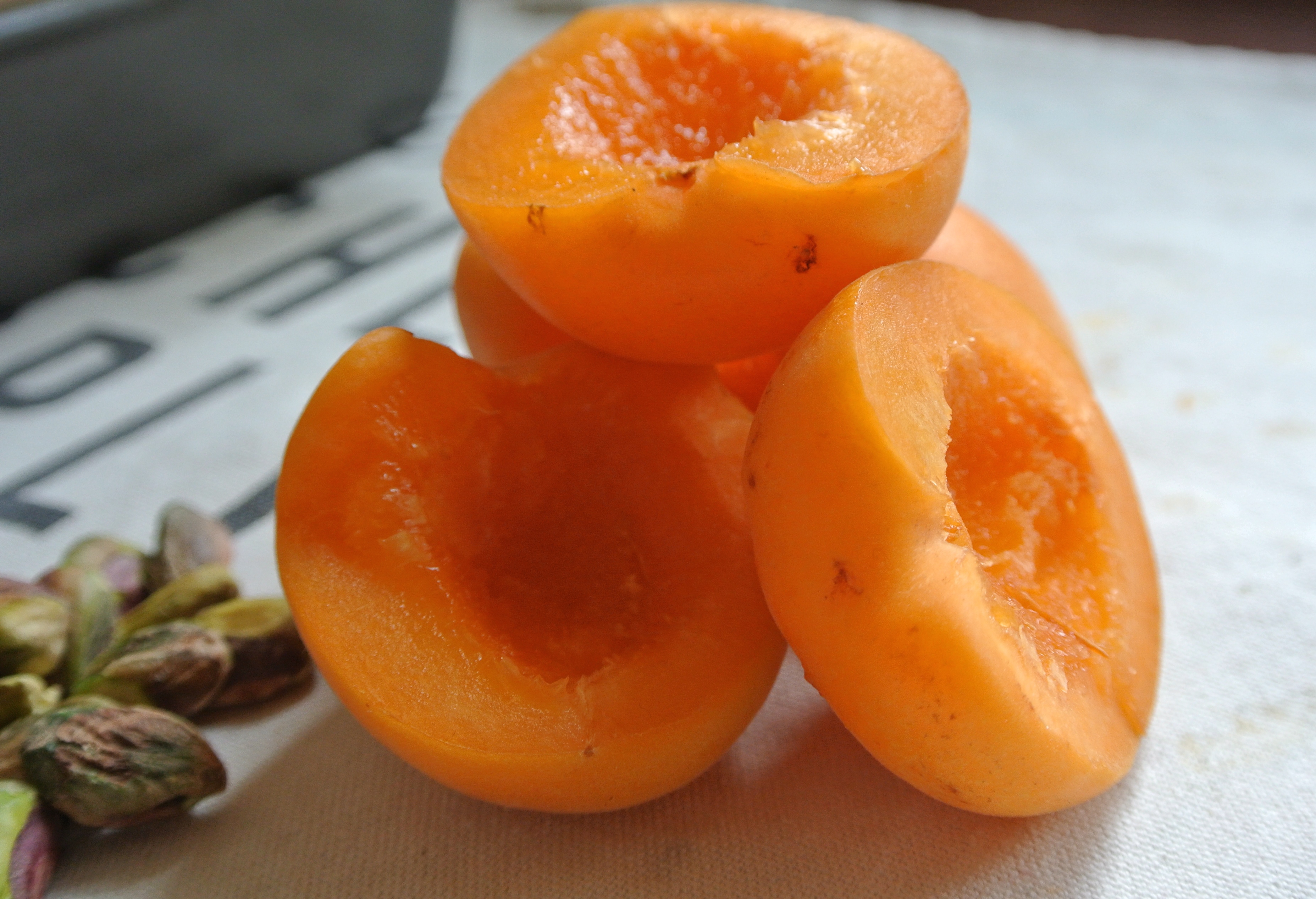 Pit apricots, slice the halves finely and arrange over the nutty paste in the baking pan. Or just use your fingers to tear the apricots and artfully arrange on top, which can be super satisfying in itself.