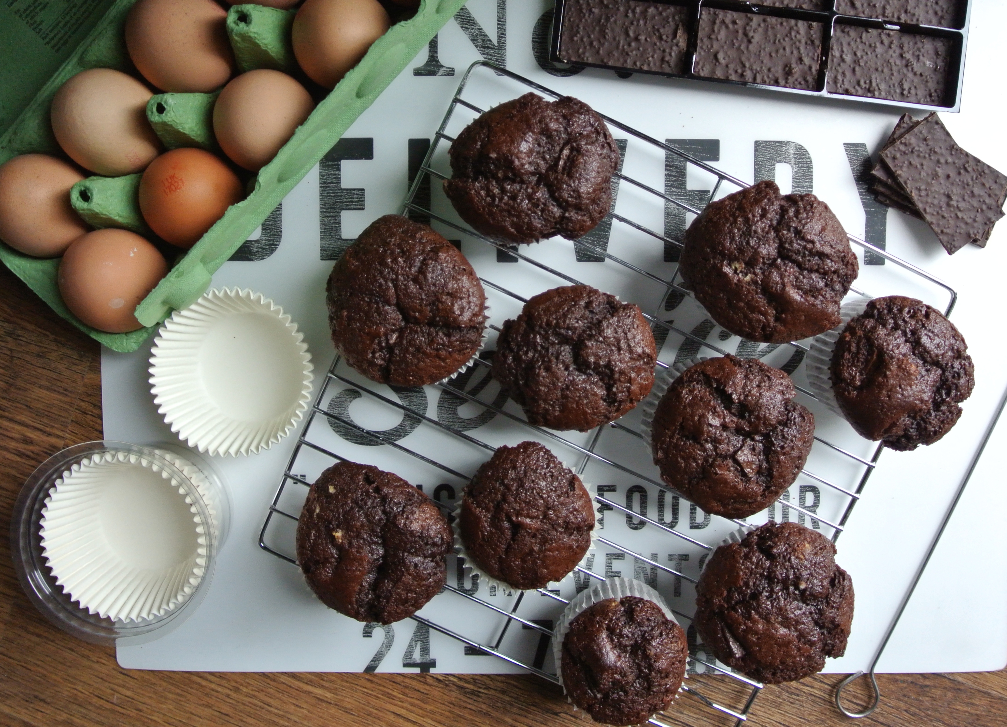 Unable to deal with the snub – and stubbornly (wonder where the kiddo gets it from…) up for a challenge – I promptly chopped up the mint thins and shoved them into a basic chocolate muffin recipe. The result? Crunchy topped, lightly minty-flavoured muffins that make a great breakfast or a cheeky afternoon snack. Guess who just ate two?!?! (If you thought me, you’re only partially wrong, I only had one, the sprog made quick work of the two. WIN!)
